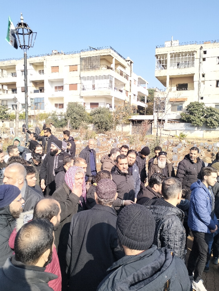 A gathering of men, primarily middle-aged and older, are closely grouped together outdoors. Most wear dark jackets or coats. Head coverings, including kufis and knitted caps, are common. A Syrian flag is visible on a lamp post in the background. Buildings with multiple floors can be seen behind the crowd. The setting appears to be a public space or park-like area, possibly a funeral.