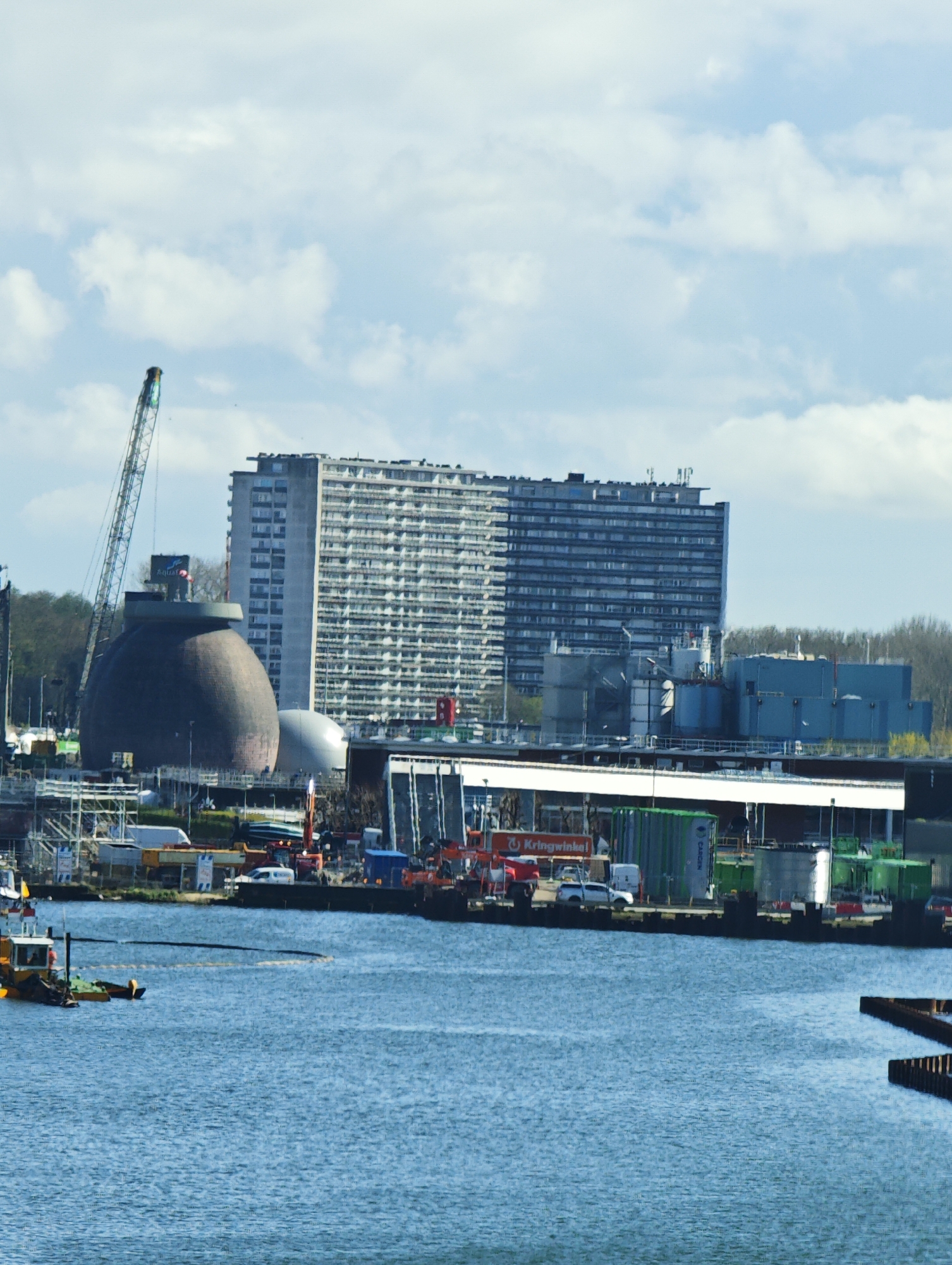 The image depicts an urban industrial waterfront scene under a partly cloudy sky. In the foreground, a body of blue water shows surface ripples. A yellow and white workboat with one discernible person onboard is present on the left, trailing a dark pipe or hose in a curved pattern. Dark, vertical pilings are partially visible at the water's edge on the right. The midground features an active industrial or construction zone along the shoreline. A prominent, large, dark grey, ovoid-shaped structure with a flat top, bearing a partially visible "Aqua" logo, stands to the left. Adjacent to it on the right is a smaller, lighter grey domed structure. A tall, green lattice boom crane is positioned to the left of the ovoid structure. The shoreline is densely packed with various objects: several shipping containers (green, red, silver), construction equipment including orange excavators, trucks, and a white van, and scaffolding structures. A long, multi-level building with a white facade extends horizontally along the immediate waterfront. Further right, a complex of blue and grey industrial buildings and tanks is visible. In the background, a tall, multi-story residential or office building with numerous windows or balconies dominates the skyline. To the far right, a line of bare trees is visible against the horizon. The location is an unidentified urban industrial port area in Unknown, Unknown.