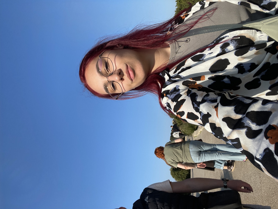 The image displays an outdoor scene on a paved pathway, identifiable as being within Pollença, Spain. A female subject is positioned in the foreground, slightly right of center, taking a selfie while looking directly at the camera. She has long, dark red hair and wears clear-framed glasses. Her attire consists of a white, black, blue, and brown abstract-patterned button-up shirt worn over a ribbed light gray t-shirt, accessorized with a silver chain necklace featuring a small circular pendant. A shadow is visible across her right cheek and chin, indicative of strong directional sunlight from the left. To the left of the primary subject, a male figure is partially visible from the chest down, oriented away from the camera. He wears a dark quilted vest over a light-colored t-shirt, with a watch on his left wrist. The paved pathway extends into the background, appearing to curve gently and ascend. Multiple pedestrians are observed walking along this path, away from the camera's perspective. One female in the midground has red-orange hair and is dressed in a light olive green t-shirt and light blue jeans, carrying a dark bag over her left shoulder. The pathway is bordered by low-lying green shrubs on both sides. The upper two-thirds of the image depict a uniformly clear and bright blue sky.