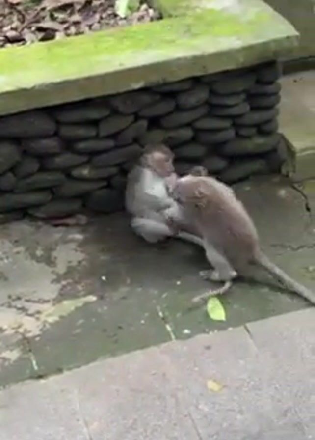 - "Two light-brown monkeys are seen grappling and fighting on a stone-tiled surface" by FM-Ppxti1, licensed under CC BY 4.0