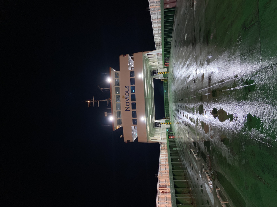 A sideways view shows a "Navibus" ship at night. The white and illuminated bridge is visible against the dark sky. Reflections illuminate a wet, green ship deck stretching into the distance, bordered by green and white railings. The sky is dark.