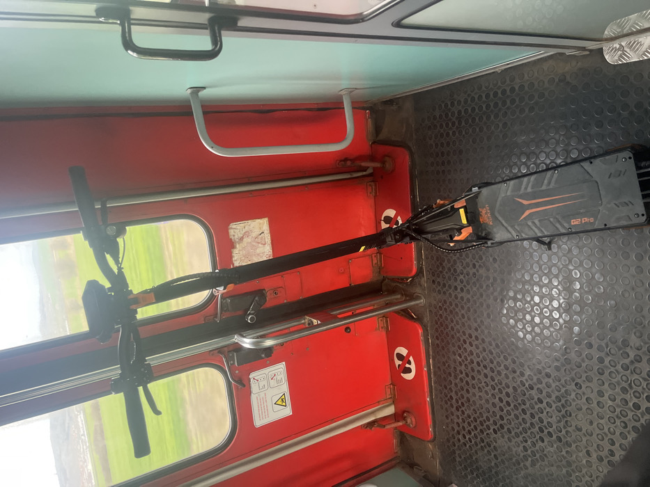 The scene is depicted within a train carriage in the city of Aytos, Bulgaria. A black and orange Kugoo G2 Pro electric scooter, identified by its deck branding, stands upright on a dark grey, studded rubber floor. The carriage interior features two red bi-fold doors with glass panels, displaying warning decals including a high voltage symbol and no-standing indicators. These doors provide a view of an external landscape comprising bright green fields and distant hills under an overcast sky, with some faint structures visible in the distance. Opposite the red doors, a light blue-green wall is visible, equipped with a silver U-shaped grab handle. A vertical silver pole is positioned between the two red doors. No individuals are present.