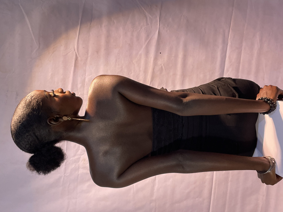A woman with dark skin lays on a pale pink surface. She wears a black dress with a mesh or lace section. Her hair is styled in a low bun. The lighting is dramatic, highlighting the contours of her body and face. She wears long earrings, a beaded bracelet, and a silver bangle. Her arms are positioned towards the viewer. The backdrop appears to be a simple sheet or cloth.