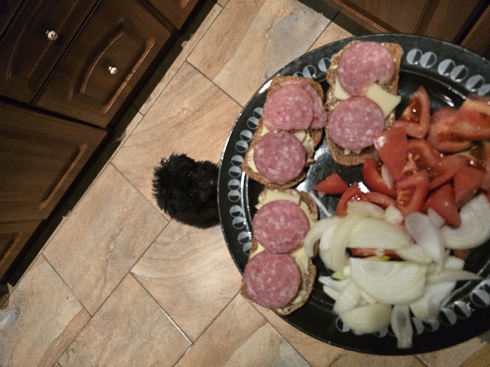 The image depicts a domestic interior, identified as a kitchen or dining area due to the presence of light brown tiled flooring with darker grout lines and dark wooden cabinets with white knob handles in the background. A small, black, curly-haired dog is situated on the tiled floor, positioned behind a black circular serving plate. The dog's head is visible just above the plate's edge, oriented towards the camera. The plate contains four open-faced toasts, each featuring a light-colored spread, a slice of light yellow cheese, and two overlapping slices of pinkish-red cured sausage. Additionally, the plate holds separate piles of sliced white onions and chopped red tomatoes. The dog appears to be observing the food items. The specific location within Pleven, Bulgaria, is not discernible from the visual evidence provided.