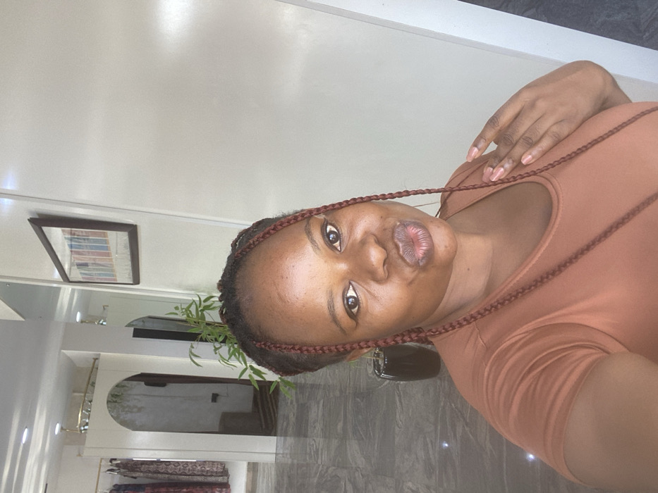 An indoor scene depicts a woman of African descent, appearing to take a selfie. She has dark skin, dark eyes, and reddish-brown box braids. Her lips are pursed, and she looks directly into the camera. She wears a rust-colored, short-sleeved top, with her left hand positioned near her upper chest, fingers slightly curled. The background indicates a commercial interior, likely a clothing boutique or showroom. The location is described as Gwarinpa, Nigeria, based on the prompt's instruction, though no specific visual identifiers for this geographical detail are present within the image. The walls are predominantly light-colored, with some glossy, reflective panels visible on the right. The floor is composed of dark, glossy tiles, reflecting light and elements within the room. To the left of the woman, a clothing rack with patterned garments is partially visible, alongside an arched doorway leading to an adjacent area. A tall, dark cylindrical planter containing a green leafy plant is situated behind the woman's right shoulder. On the right wall, a framed picture or artwork, featuring multiple vertical colored segments, is displayed. The space is illuminated by overhead recessed lighting fixtures. No other individuals are present or engaged in discernible actions.