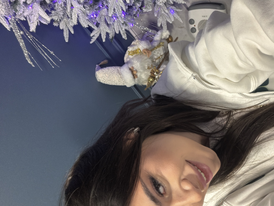 The scene is an indoor setting in Yerevan, Armenia. The primary subject is a female, partially visible in the left and central foreground, with dark hair parted on the side and styled loosely. She is smiling, looking towards the camera. She wears a white zip-up hoodie over a lighter garment, possibly a t-shirt or tank top. In the right background, a white artificial Christmas tree with purple lights and silver tinsel branches is visible. To the left of the tree, a decorative figurine of a Santa Claus-like figure is present, featuring a white and gold outfit, a long white beard, and a tall, pointed white hat with a gold pattern. This figure holds a gold staff. A small white electronic device with black buttons is located on a surface in the lower right background, beneath the tree. The wall in the upper background is a solid dark blue color.