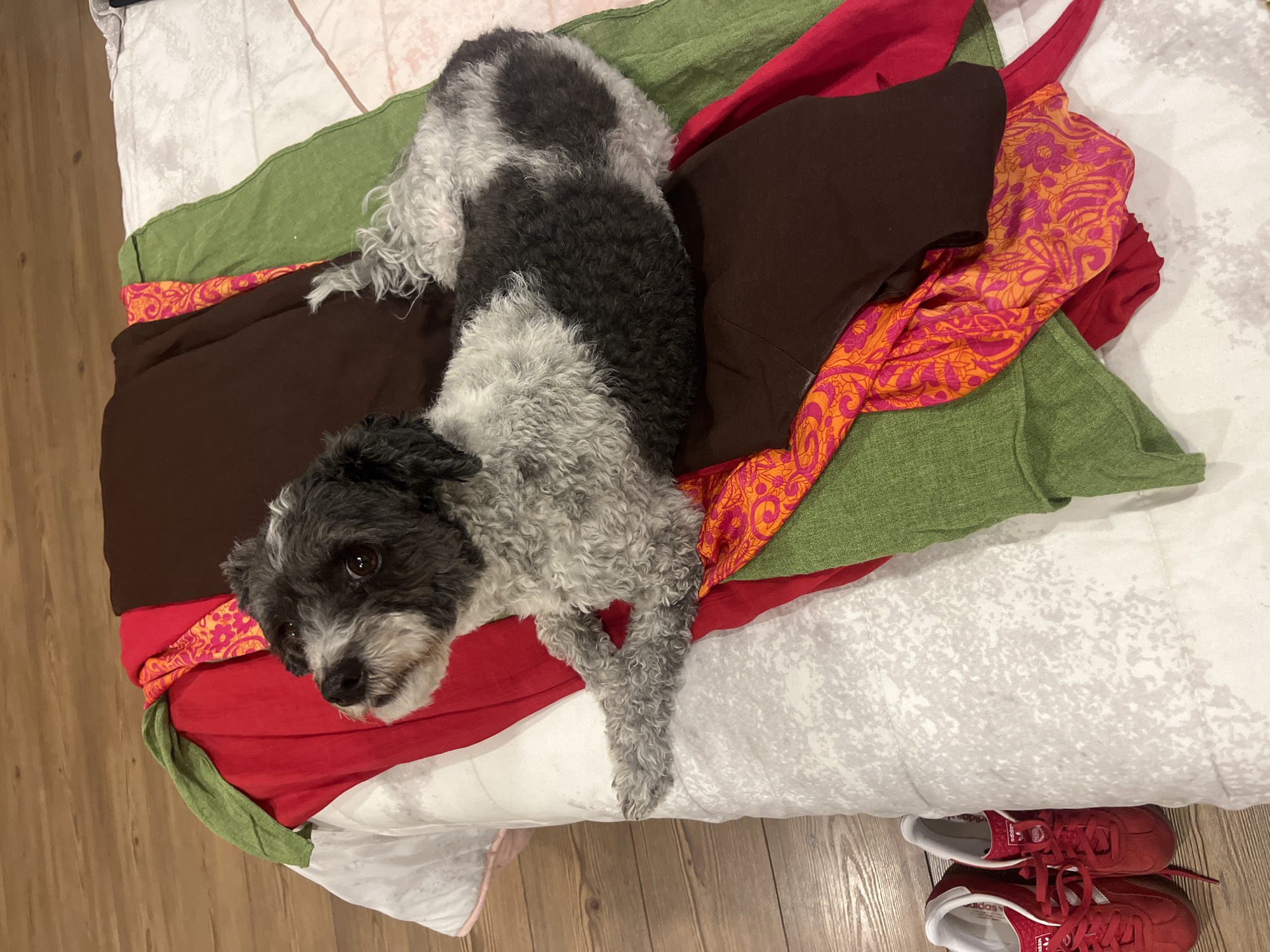 An indoor scene depicts a small, curly-haired dog, black and white, resting on a pile of various fabrics