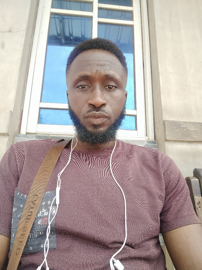 young African man sitting in front of a window with a white frame. He is wearing a maroon t-shirt with a brown strap from a bag over his shoulder. The strap has "united" written on it. The man has a full beard and short black hair. His arms are folded in front of him. White earphones can be seen hanging from his shirt. The man is looking directly at the camera. The location is Jos, Nigeria, based on the latitude and longitude provided. The background is a white wall with a window. The room is well-lit, and there is no other person visible in the image.