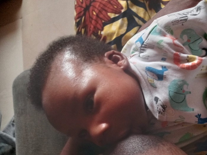 The image depicts an infant being held by an adult in an indoor setting in Sabon Tasha, Nigeria