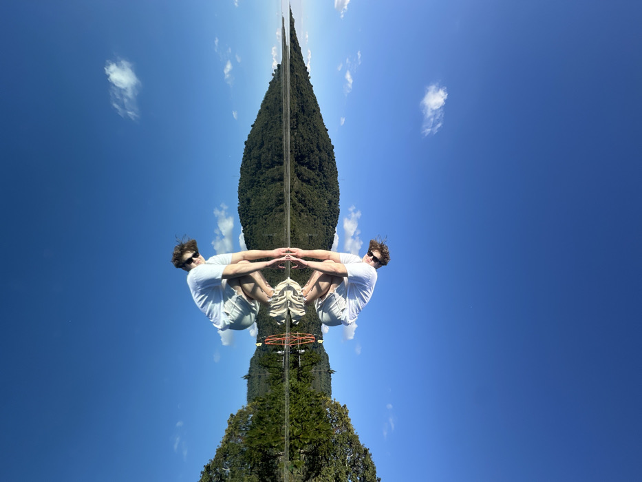 A surreal, symmetrical image shows a mirrored scene. Two figures wearing white shirts and sunglasses sit facing each other, their hands touching. Above and below them, a tall, dense line of trees stretches to the top and bottom edges. A road bisects the tree line. Blue sky with scattered clouds fills the spaces around the central element, enhancing the dreamlike quality of the image.
