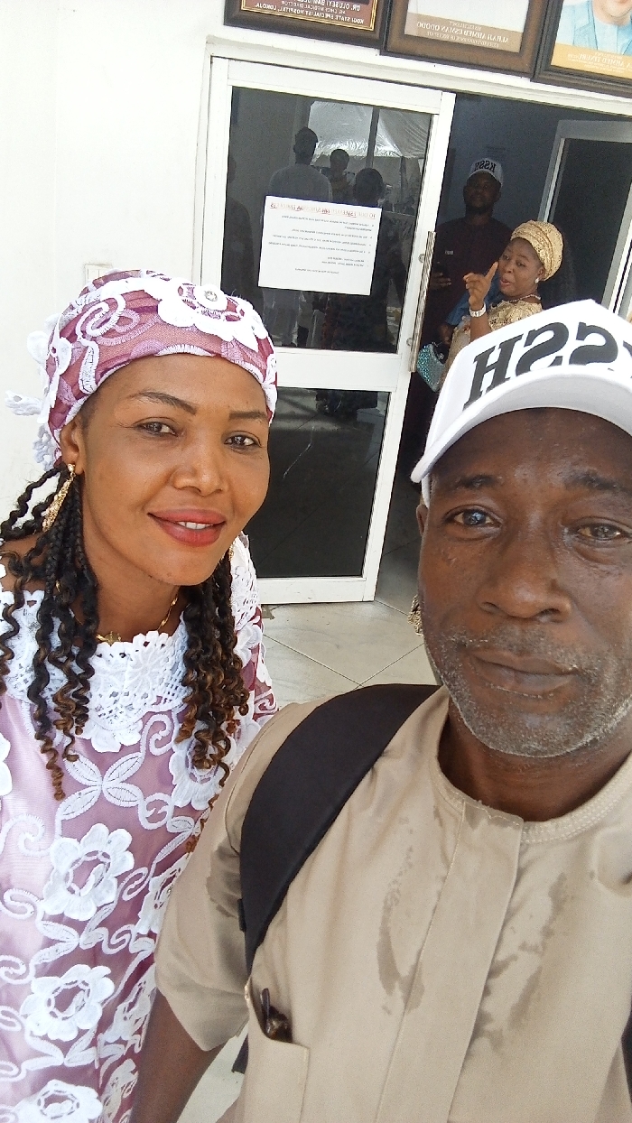 A close-up photograph captures two individuals posing at the entrance of a building identified as Kogi State Hospital Lokoja, located in Adankolo, Nigeria