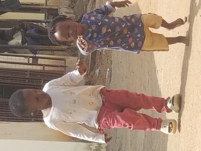 An outdoor scene in Adankolo, Nigeria, depicts two children and a distant adult on a dirt ground under bright daylight