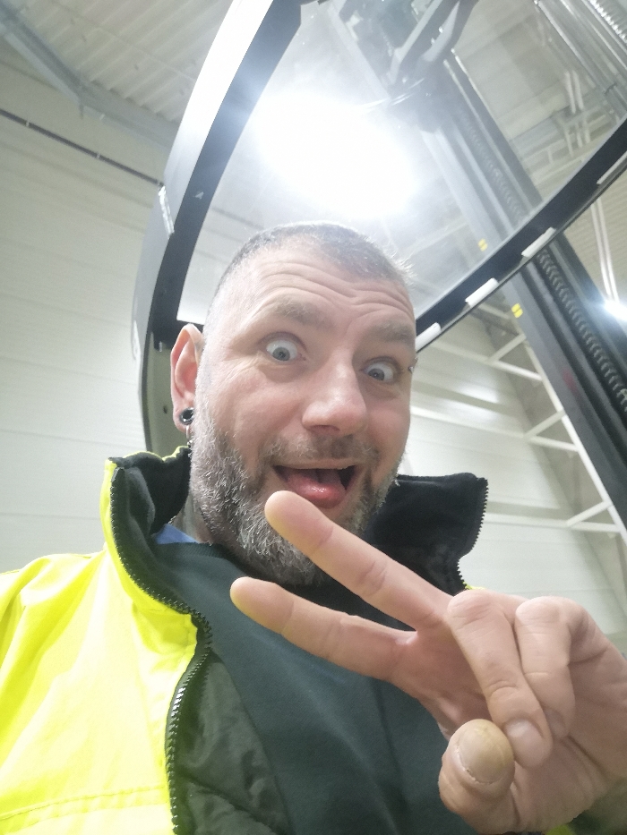 This is a close-up image of a single male individual inside an indoor industrial or warehouse facility in Pardubice, Czechia