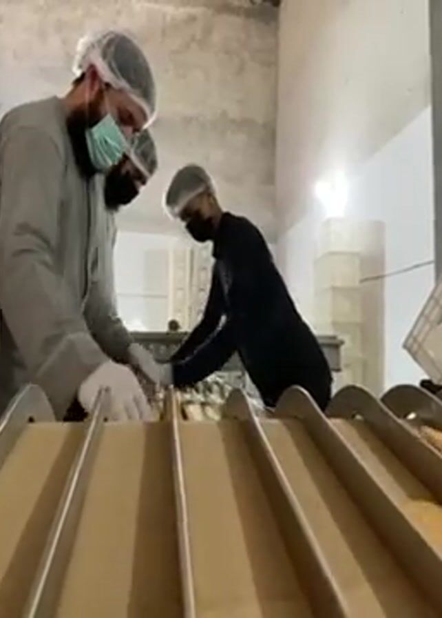 In a brightly lit, industrial setting, three individuals work along a conveyor belt transporting what appear to be circular, light brown baked goods