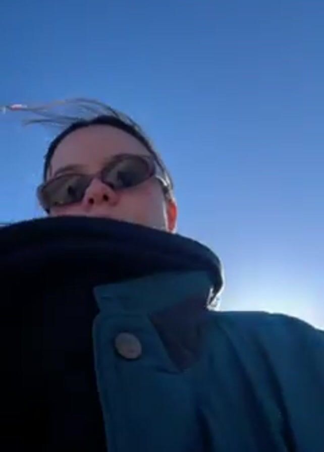 A person with sunglasses stands outside in bright sunlight under a clear blue sky. The person is wearing a dark jacket with the collar pulled up. Their hair is blowing in the wind.