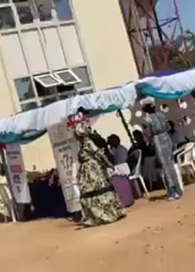 church event taking place outside the church building. Several people in colorful clothing are gathered near a decorated canopy set up in the courtyard. There are white plastic chairs, a speaker, and a water tank in the background. People are dancing and talking. The camera appears to be held by someone who is walking around the event. The sky is clear and the weather is sunny.