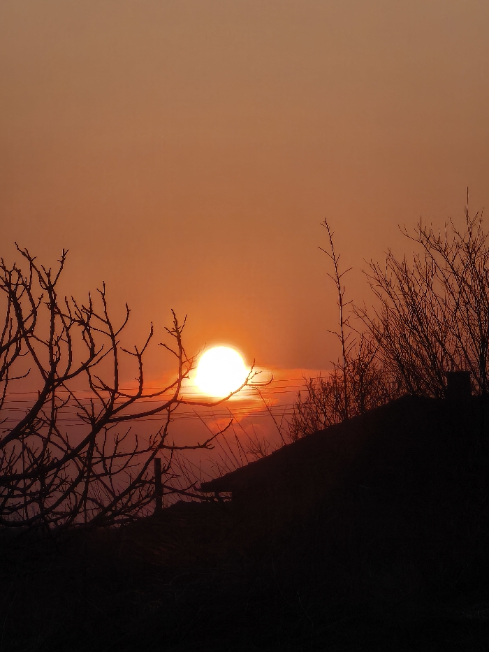 The image displays a sunset or sunrise over Slavyanovo, Bulgaria. The sky is dominated by a gradient of orange and red hues, intensifying to a bright, fiery orange directly around the sun. The sun itself is a prominent, intensely glowing white-yellow orb positioned low on the horizon, slightly to the left of the central vertical axis. In the foreground on the left, a dense network of bare tree branches is silhouetted against the bright sky, extending upwards from the bottom and partially obscuring the sun. Multiple horizontal lines, consistent with utility wires, are visible as dark, thin filaments across the mid-ground. To the right, a dark silhouette of a building, featuring a pitched roof and a chimney, occupies the lower mid-ground. Additional silhouetted bare branches and shrubbery are present on the right, partially in front of and above the building. The scene depicts an outdoor environment, devoid of visible individuals or discernible actions.