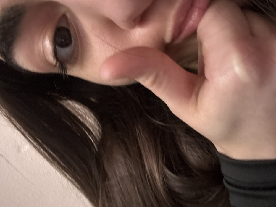 A close-up, angled portrait captured in the city of Yerevan, Armenia, shows the right side of a person's face and their right hand. The individual possesses dark brown, wavy hair covering the upper left of the frame. Their right eye is visible, featuring a dark iris and pupil, with defined eyelashes. Portions of the nose and pink lips are present on the right side of the face. The person's right hand is positioned in the lower center, forming a "thumbs up" gesture, with the thumb near the corner of the mouth and the index finger extending along the cheek/chin area. A dark, long-sleeved garment is partially visible on the lower left. The background consists of a plain, light-colored wall with minor textural variations.