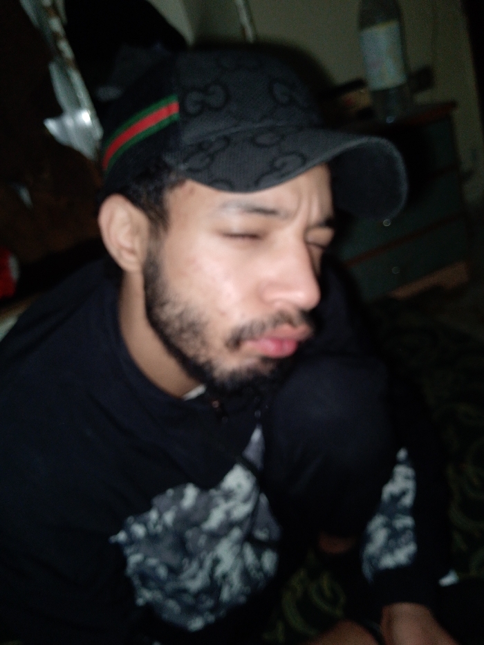 A blurry image shows a person wearing a Gucci hat with a green and red stripe. The person has dark hair, a beard, and closed eyes, and is wearing a dark shirt with a light-colored design. In the background, there is a water bottle on top of a dark cabinet. A patterned carpet is visible at the bottom.