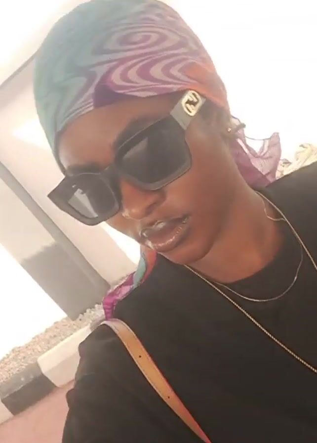 dark-skinned person wearing a headscarf, sunglasses, and a black t-shirt with a gold Africa pendant. The person is standing outdoors in what appears to be a brightly lit area. The person adjusts their headscarf with their right hand, revealing a gold watch on their wrist. The person makes a kissing face. The environment has some white concrete and asphalt with black stripes. A brown purse with a red strap is visible on the person's shoulder. Another person can be heard speaking in the background.