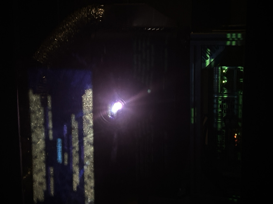A dark, enclosed space contains a computer server. The server's interior is illuminated with green lights and circuitry. To the left, a glossy, dark surface reflects a light source, creating a bright, lens flare effect. Vertical patterns of light and dark are also reflected, perhaps from another part of the equipment or environment. An air duct is faintly visible at the top left. Overall, the image presents a technical or industrial setting with dramatic lighting.