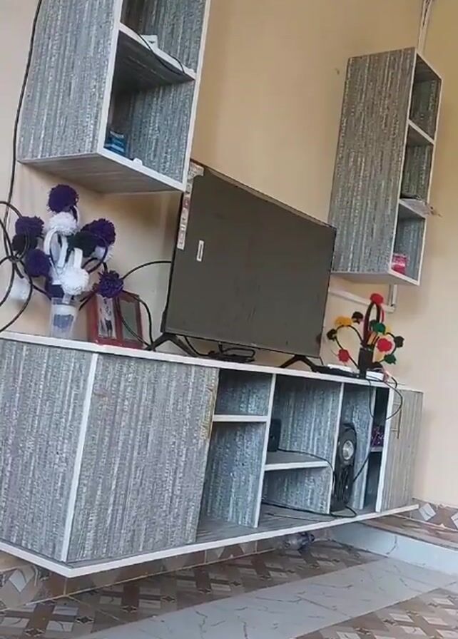 A static shot shows a wall-mounted entertainment center in a living room