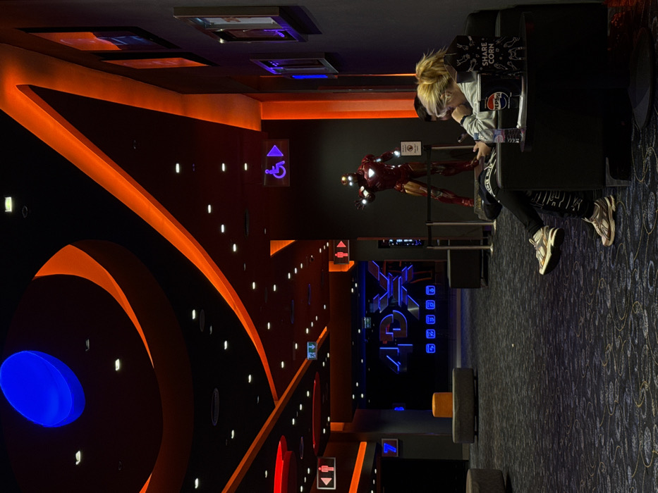 The scene depicts a modern cinema lobby within Cinema City at Paradise Center in Sofia, Bulgaria. The environment is dimly lit with a dark grey and black color scheme, accented by prominent orange neon light strips forming curved architectural lines on the ceiling and walls. A large, oval-shaped blue light fixture is visible on the upper left ceiling. The floor is carpeted with a dark blue-grey pattern. In the mid-ground, a life-sized Iron Man statue, colored red and gold with illuminated chest and gauntlets, stands upright on a dark base, positioned near a wall with a purple illuminated sign displaying a wheelchair symbol and a right-pointing arrow. Further into the background, a large blue neon sign reads "4DX" above a series of smaller blue icons, indicating a specific cinema hall. Other illuminated directional signs, including male figure symbols and arrows, are present throughout the area. In the foreground, two individuals are seated on a black armchair. The person on the left, with blonde hair pulled into a ponytail, wears a grey hooded top and dark trousers with patterned sides, paired with light-colored athletic shoes. This individual is looking down at a mobile phone held in their hands, resting their chin on their left hand, with legs crossed. The second individual, partially obscured, is seated to their right. On a small black side table next to them, a clear plastic water bottle, a blue and white "Pepsi" branded cup with a straw, and a black bucket labeled "SHARE CORN" are visible. Several dark grey upholstered ottomans, some topped with orange-yellow cushions, are scattered in the mid-ground, serving as additional seating.