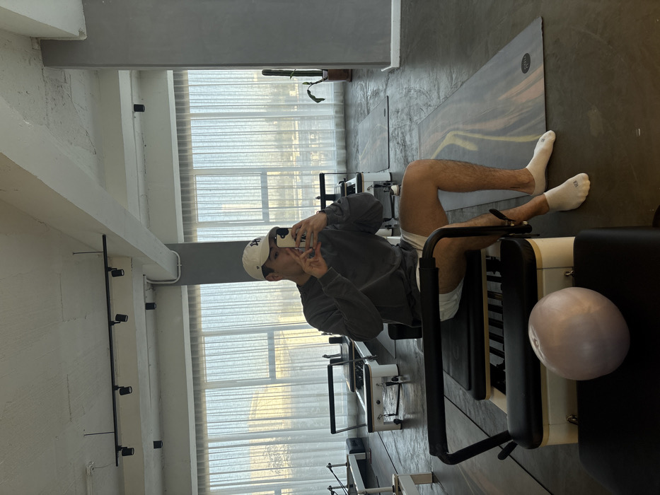 The image depicts a male individual taking a mirror selfie inside a modern Pilates studio, located in Puebla, Mexico