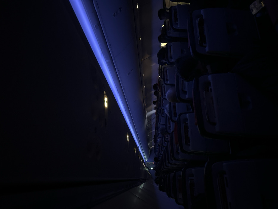 An airplane interior, viewed from the aisle. Blue ambient lighting illuminates the ceiling. Rows of dark seats extend down the plane, most occupied by passengers whose heads are barely visible. The dim lighting and tight space create a sense of confinement.