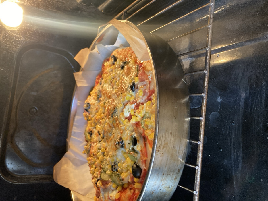 A round pizza, topped with melted mozzarella cheese, yellow corn kernels, sliced black olives, green bell peppers, and white cheese crumbles, rests on a red sauce base. The melted cheese exhibits slight browning in areas. The pizza is contained within a circular metallic baking pan, lined with crumpled parchment paper around its perimeter. The pan is positioned on a metal wire oven rack inside a dark oven interior. An illuminated incandescent oven light is visible in the upper right section of the oven. No individuals are present. The scene is located within a kitchen in Raduil, Bulgaria.