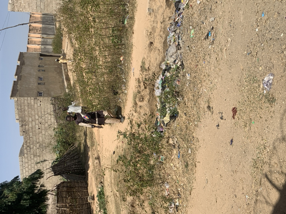 The image displays an outdoor scene in Dabawa, Nigeria, under a clear, light blue sky. The ground consists primarily of dry, reddish-brown dirt, with sparse patches of green shrubs and dry grass. Three male individuals are visible. In the midground, a young male walks towards the viewer on a dirt path. He wears a dark long-sleeved tunic, light-colored trousers, and dark footwear, with a multi-colored fanny pack strapped across his chest. Behind him, another male, wearing a light-colored tunic, walks away from the viewer on the same path. Further in the background, a third male in light attire is visible near a building. Across the midground, a visible ditch or depression is filled with an accumulation of refuse, including plastic bags and various discarded materials. On the left side of the scene, a rounded structure constructed from woven branches or sticks stands next to a conical stack of similar materials. The background features several buildings in varying states of construction, composed of grey concrete blocks. One building exhibits three small, rectangular windows.