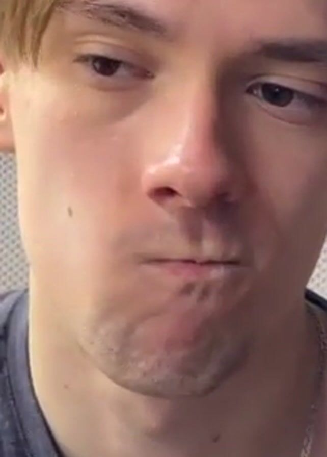 A close-up video shows a young man with blondish-brown hair and a light stubble beard