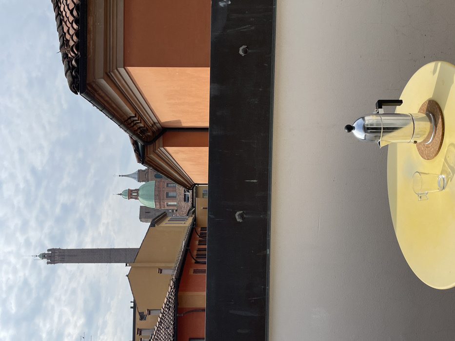 rooftop patio in Bologna, Italy, located at the coordinates 44.494 latitude and 11.35 longitude. The patio is enclosed by a black railing and features a white wall. A yellow table sits in the center of the patio, with a silver coffee pot and a glass cup placed on its surface. The coffee pot has a black handle. The background shows a view of the city's skyline, including several buildings, one tall tower, and a church with a green dome. The sky is partly cloudy.