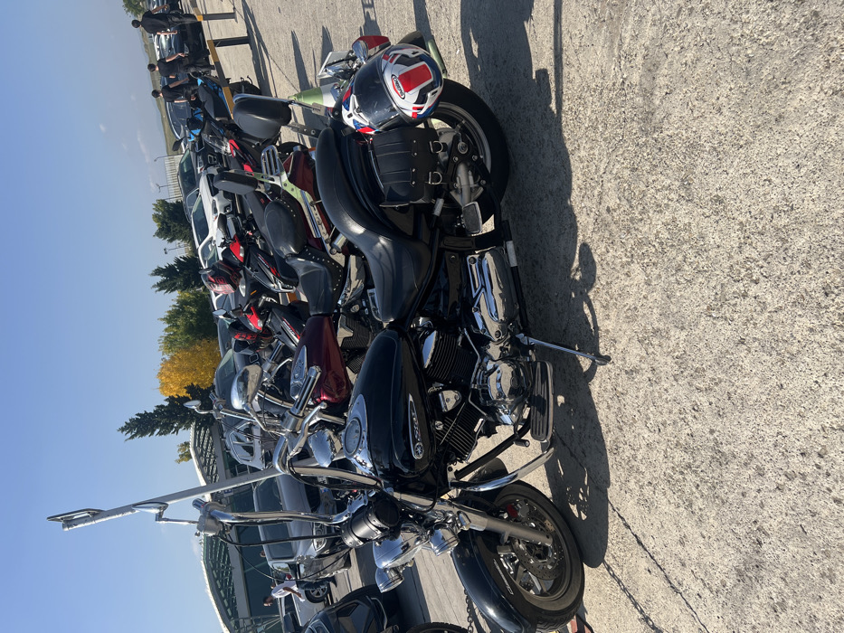 The image depicts an outdoor parking area in Rustavi, Georgia, under clear, bright daylight. In the foreground, a black Yamaha V-Star custom cruiser motorcycle with chrome accents, extended ape-hanger handlebars, and a kickstand deployed is parked on a light grey concrete surface. A white, red, and blue full-face helmet is resting on the motorcycle's rear fender, adjacent to a black leather saddlebag. Behind the foreground motorcycle, a line of various other motorcycles and scooters, predominantly dark-colored, are parked. Further back, a row of parked automobiles, including several SUVs and sedans, is visible. To the left, a man in a light-colored shirt stands near a dark vehicle, partially under an arched, covered structure. Towards the right background, three individuals wearing dark clothing are walking away from the viewer. The background features a clear blue sky, trees with green and autumnal yellow foliage, and faint distant hills or mountains. Shadows cast on the concrete indicate direct sunlight.