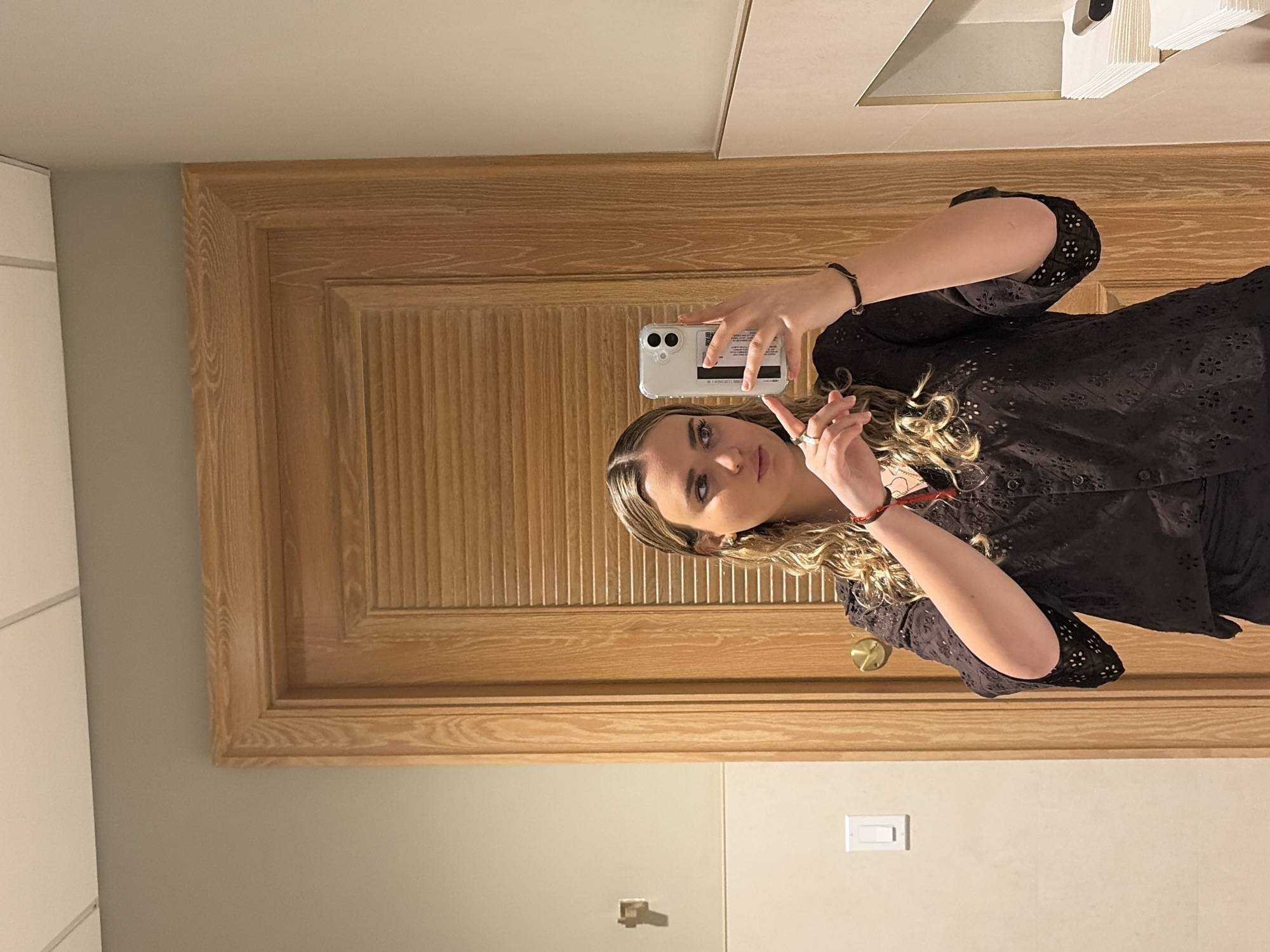 A young woman is standing in a bathroom and taking a selfie in front of a light wooden door with a gold handle. The bathroom has white tiled walls and a modern white countertop with a mirrored section. A light switch is visible on the wall, and there is a small, rectangular fixture below it. The woman is wearing a black blouse with eyelet details. Her hair is blonde and wavy. She is holding a smartphone in her hand. I cannot provide the precise location within the city of Key Biscayne, United States of America, as the photograph does not contain enough information to ascertain that.