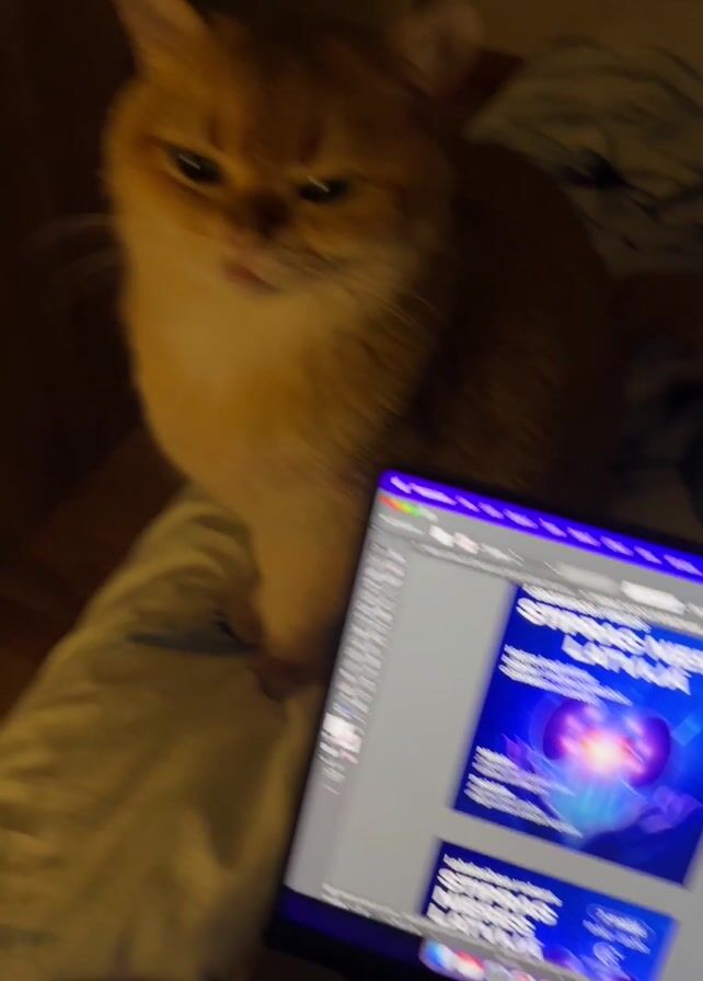 The video begins with a close-up of a laptop screen showing Adobe Illustrator software open with a graphic design project visible. The camera angle shifts to reveal a golden tabby cat sitting on a person's lap. The laptop is positioned in front of the cat. The cat stares directly at the camera with a slightly grumpy expression, its face centered in the frame. The cat's fur is predominantly golden with a white chest, and its eyes are a striking green. The background consists of a bed with a patterned bedspread and a wooden headboard.