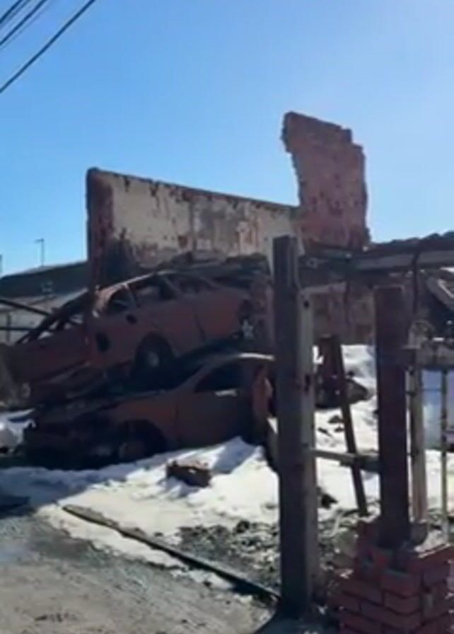 scene of destruction. Two cars are piled on top of each other in the foreground, appearing to be severely damaged and charred. Behind the cars, the ruins of a building are visible, with brick walls partially standing and debris scattered around. There is snow on the ground, suggesting a cold climate. A brick structure and metal pipes stand in the foreground to the right of the cars. The sky is clear and blue, with the sun shining brightly.