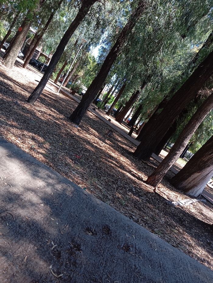 An angled shot showcases a park or wooded area. Tall, slender trees cast long shadows across a ground covered in dry leaves and debris. A paved surface, likely a sidewalk or path, runs along the bottom left, exhibiting dark markings and leaf litter. The trees' foliage creates a canopy overhead, filtering sunlight and adding depth to the scene.