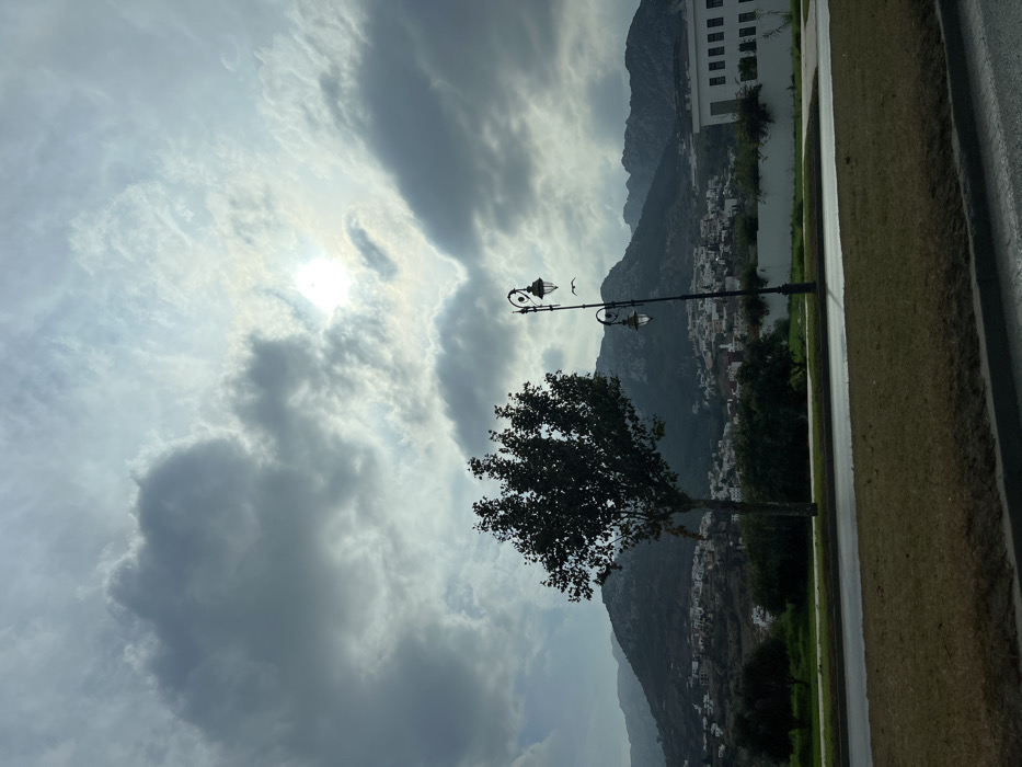An outdoor, daytime image captures a panoramic view of Tétouan, Morocco, under an overcast sky with a visible sun. The scene is observed from a slightly elevated position, possibly from a vehicle, indicated by a dark, reflective surface at the bottom edge. The sky occupies the upper half, featuring a dense layer of dark grey and white clouds. The sun is discernible as a bright, hazy, circular light source breaking through a thinner cloud patch in the upper right quadrant. The midground features a prominent, dark green deciduous tree with a somewhat sparse canopy, positioned left of center. To its right stands a tall, black metal street lamp with two ornate, curved arms, each holding a street light fixture. Two small, dark birds are captured in flight near the upper lamp. Below these elements, a horizontal band of dark green grass and vegetation is visible, followed by an asphalt road that appears dark and somewhat reflective. The background presents the city of Tétouan spreading across the lower and mid-slopes of a mountainous terrain. Numerous white-walled buildings with some reddish roofs are densely clustered. Behind the urban sprawl, a range of dark, rugged mountains, consistent with the Rif mountains, rises sharply, extending across the horizon under the cloud cover. To the far right, a modern-looking, multi-story white building with dark, rectangular windows is partially visible above a white wall. No human figures are present.