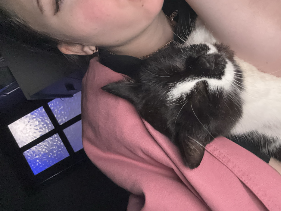 A person is holding a black and white cat. The cat is nestled against the person's chest and shoulder, appearing relaxed or asleep. The person is wearing a pink shirt, and a gold chain is visible around their neck. In the background, there is a window with a frosted or patterned glass. The window has a grid-like structure.