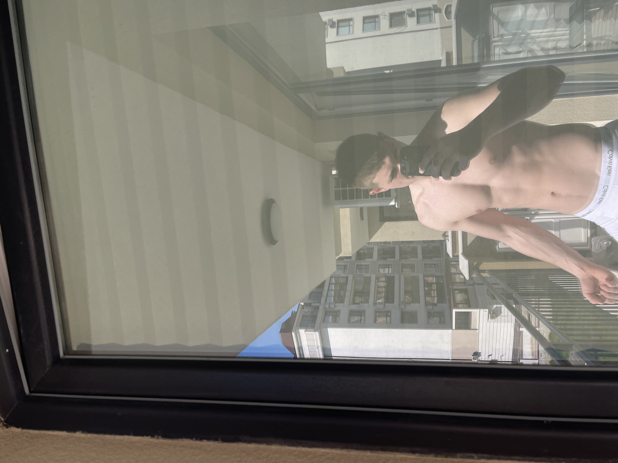 A reflection in a window shows a shirtless man holding a smartphone, along with the urban landscape of Varna, Bulgaria. The buildings in the background are typical residential structures, with white or light-colored facades and multi-story designs. The man is wearing white underwear with a visible Calvin Klein waistband. He appears to be taking a selfie in the window, which also reflects the building across from him. A balcony with railings is visible, and the sky is visible in small areas.