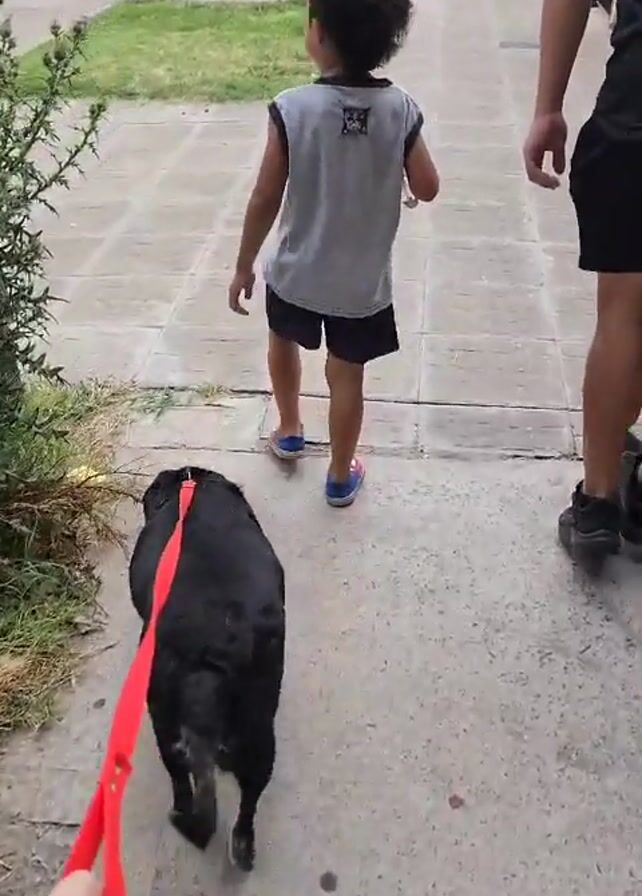 A medium-shot video shows a young boy, a young adult, and a black dog walking away from the camera on a paved sidewalk