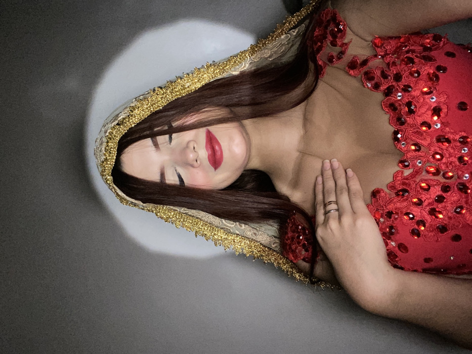 A woman with long, dark hair is lying down, eyes closed, wearing a red dress adorned with red jewels and lace. A gold-trimmed, off-white veil frames her face. Her lips are painted a vibrant red. Her hand rests gently on her chest, fingers slightly curved, revealing two rings. A bright, circular light source illuminates the top left portion of the frame, contrasting against the muted gray background.