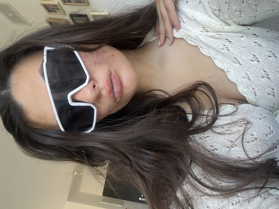 A female individual is depicted in a close-up, chest-up indoor photograph taken in Kiryat Bialik, Israel. She possesses long, dark brown hair that flows over her shoulders and chest. She wears large, wraparound-style sunglasses with speckled white frames and dark lenses, obscuring her eyes. Her visible facial skin, particularly on the cheeks and chin, shows multiple reddish blemishes. Her lips are full, appearing slightly parted and possibly glossed. She is clad in a light-colored, open-knit top, potentially cream or off-white, with a V-neckline. Her right hand, featuring manicured nails, rests on her left collarbone area. The background is softly blurred, revealing a light-colored wall with several small, framed objects on the right, and a dark vertical element on the left, suggesting an interior room.