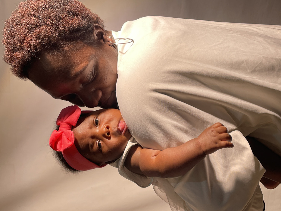 An adult individual, appearing female, with dark skin and short, reddish-brown afro-textured hair, is depicted holding an infant. The adult wears a light-colored, high-necked garment and a silver-colored, abstract-shaped earring in the visible ear. Her eyes are closed, and her head is turned towards the infant, with her cheek close to the infant's temple. The infant, also with dark skin, is wearing a red headband with a prominent bow and a light-colored dress with a visible sheer overlay. The infant's face is directed towards the viewer, with its tongue slightly extended. The scene is illuminated by strong, warm, directional lighting from the left, creating highlights and soft shadows. The background is a plain, light-colored wall or backdrop. This scene occurs in the city of Barakin Akawo, Nigeria.