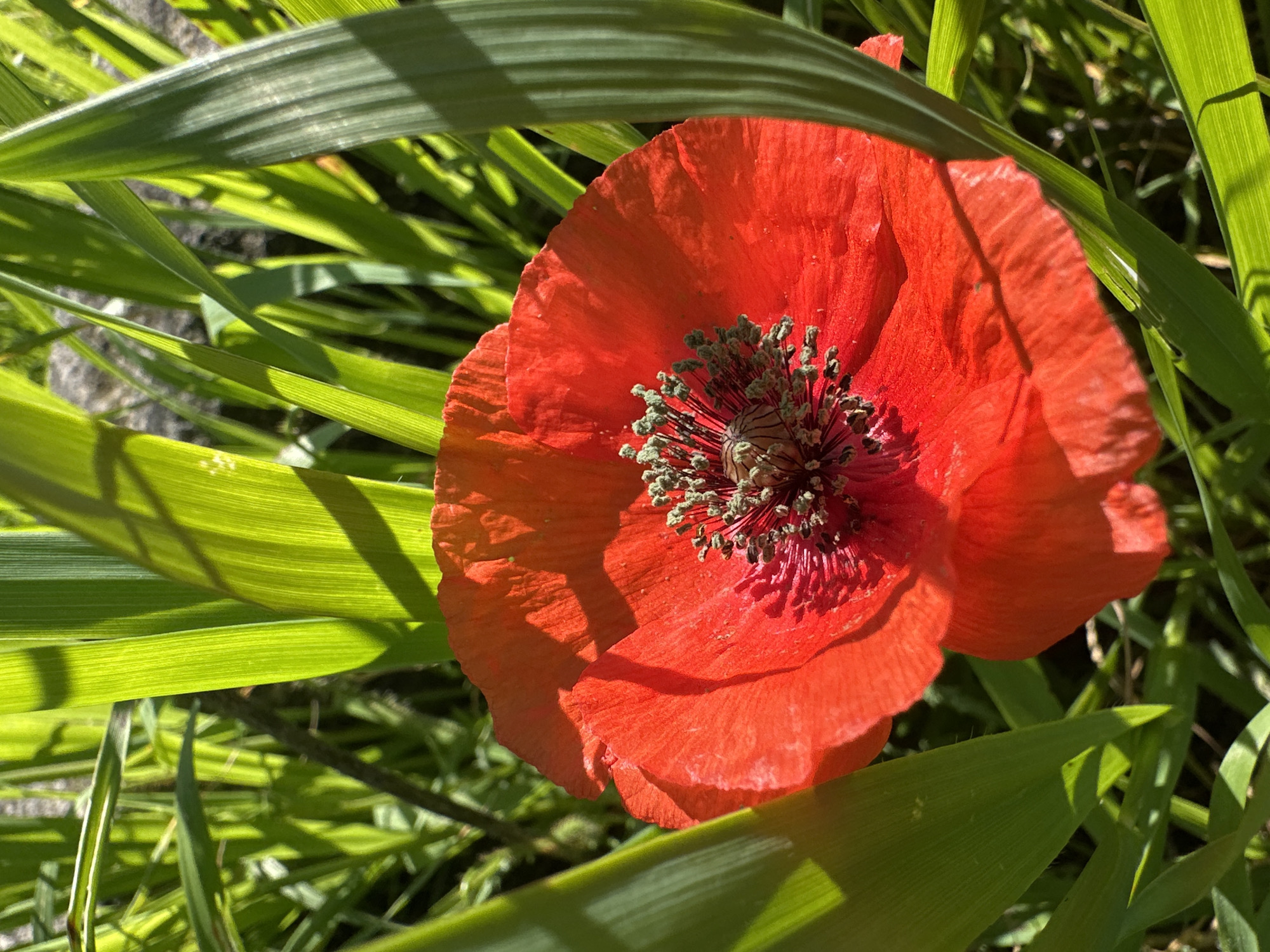 A close-up shot of a red poppy flower surrounded by green grass-like foliage. The poppy is in focus, showing detailed texture of the petals and the central seed pod. Sunlight filters through the grass, casting shadows on the poppy and some of the leaves. The background is blurred, but hints at more green foliage and perhaps some rocks or stone. While the origin of the image is Cutrofiano, Italy, there is nothing in the image itself to suggest that. The subject is simply a flower, with surrounding foliage and sunlight. There are no people, interactions, or objects that indicate a specific location.