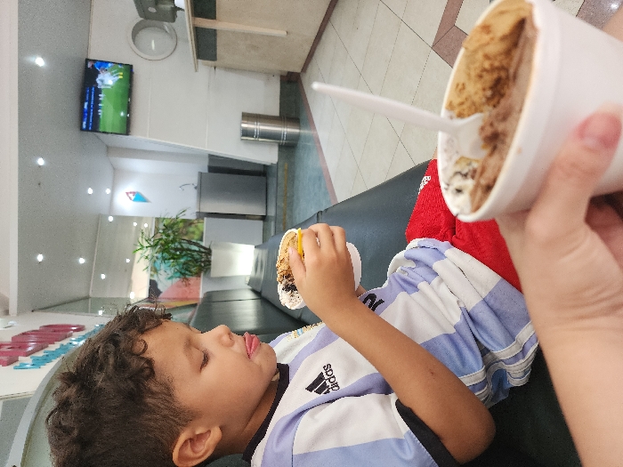 A young male child, approximately 5-8 years old, with dark curly hair, is seated on a dark upholstered bench. He is wearing a blue and white striped Adidas shirt and red pants. The child holds a white polystyrene cup containing ice cream with chocolate bits and a beige topping, using a yellow plastic spoon, with his tongue slightly extended. In the immediate foreground, a hand holds another identical white polystyrene cup containing multiple scoops of ice cream and a white plastic spoon. The background reveals an indoor commercial space with a tiled floor and a ceiling featuring recessed lights. A flat-screen television mounted on a white wall displays a football match. To the left of the television, a stainless steel water fountain and a large planter with a green plant are visible. A cylindrical stainless steel trash can is on the floor. The scene depicts two individuals consuming ice cream in what appears to be an ice cream parlor or food court within the city of Unknown, Unknown.