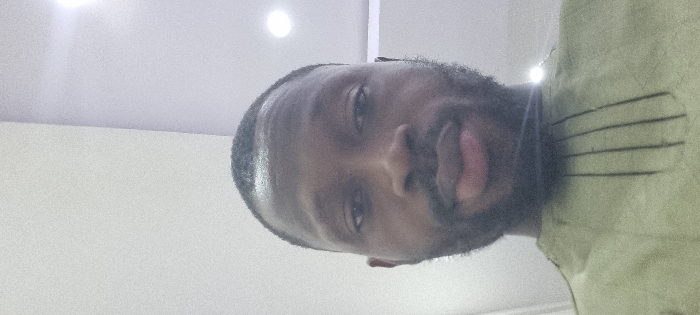 A close-up, head-and-upper-chest portrait features one adult male subject with a dark complexion, short dark hair, and a full beard. The subject is looking directly at the camera with a neutral expression. He is wearing a light olive-green garment featuring a stand collar and vertical pleats down the front center of the chest. The background is an indoor setting characterized by light-colored, likely white or off-white, walls and a ceiling. A bright, circular recessed light fixture is visible in the upper right quadrant of the image, emitting white light. A softer glow, possibly another light source or reflection, is present on the upper left ceiling area, where a subtle architectural detail or change in ceiling plane is discernible. The specific location within Ikeja, Nigeria, cannot be determined from the visual information provided in the image.