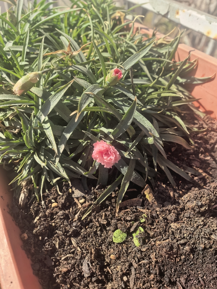 The image displays a flowering plant situated within a terracotta-colored rectangular planter, located in Varna, Bulgaria. The plant features dense, slender green foliage. Centrally, one small pink flower with visible serrated petals is fully open. To its upper right, a distinct pink flower bud is present, and to its upper left, an elongated, light green, unopened bud is visible. Minor desiccation is evident on some leaf tips, and the foliage appears to be coated with fine particles. The plant is rooted in dark brown, granular soil containing organic debris. In the lower right quadrant of the soil, two small, bright green sprouts are observable. Strong sunlight illuminates the scene from the upper right, casting pronounced shadows within the planter. The blurred background indicates an outdoor environment, possibly a balcony or window ledge, with indistinct light-colored structures and faint green elements visible. No individuals, animals, or active interactions are depicted.