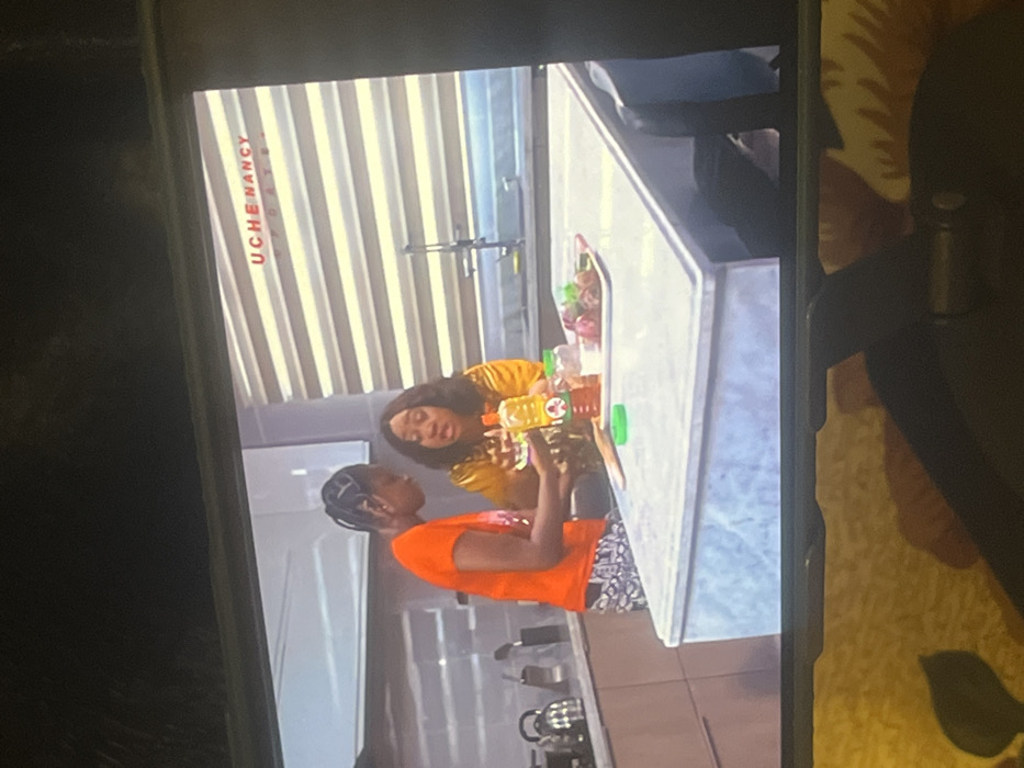 Two women stand at a kitchen counter, engaging in a conversation. One wears an orange shirt and patterned pants, while the other sports a mustard yellow top. Bottles and produce are scattered on the counter. The background reveals vertical blinds and a modern kitchen design. "UCHENANCY" is displayed in red letters, seemingly a watermark. The image appears to be captured from a phone screen, with a blurred foreground.